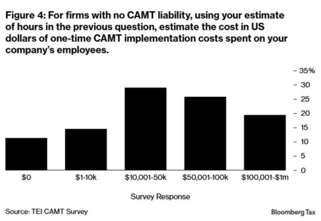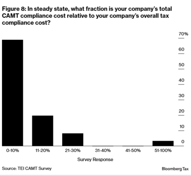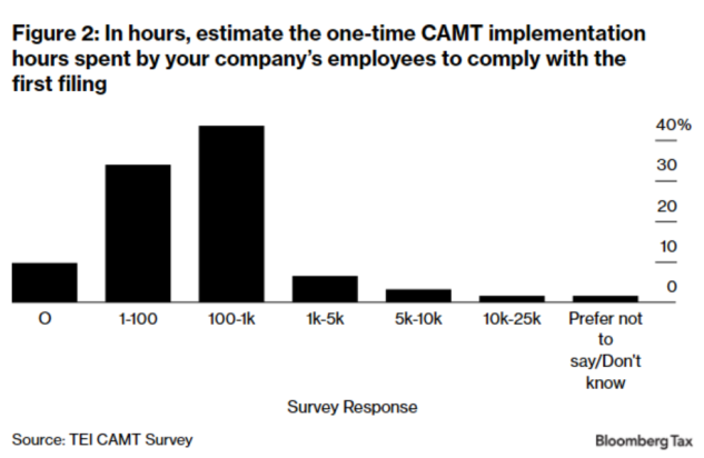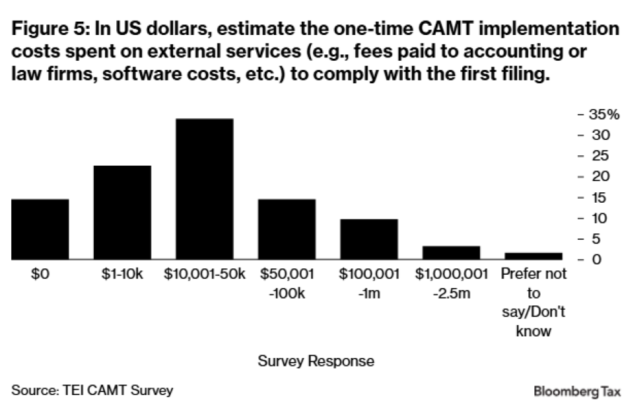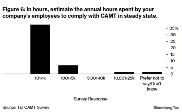 The survey is designed to capture both one-time implementation costs and steady-state annual compliance costs. The results suggests that CAMT has created significant new compliance costs without clearly delivering its intended benefits. Survey respondents report substantial one-time and ongoing expenses for CAMT calculations—often incurred by companies that rarely, if ever, owe CAMT. As a result, CAMT now accounts for a nontrivial share of overall tax compliance efforts. The qualitative comments consistently highlight a common theme: CAMT is complex, costly, and frequently burdens firms that pay little to no CAMT. As one respondent noted, CAMT is a “compliance burden and nightmare.”