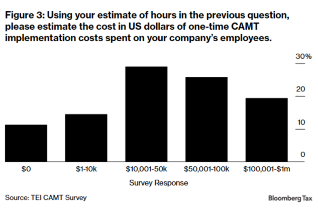 The median CAMT-affected company reports between 100 and 1,000 internal hours devoted to initial CAMT implementation, with a significant share of firms indicating even more hours. Figure 3 shows that nearly 20% of respondents reported compliance costs exceeding $100,000 from internal one-time implementation costs.